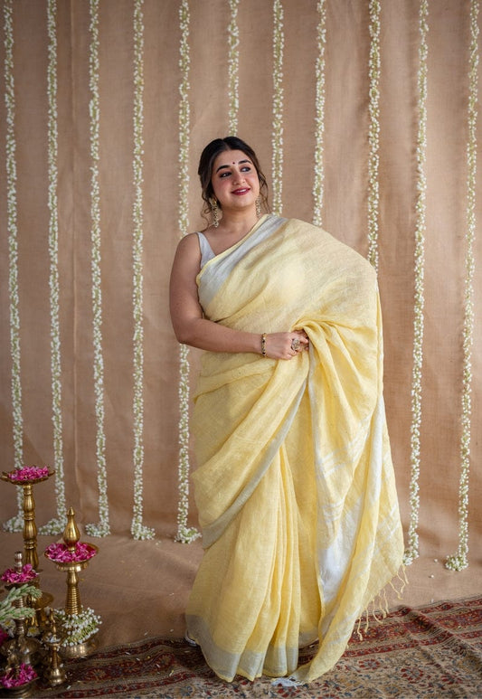PJFB25A002 Yellow Silver Pure Handloom Linen Saree