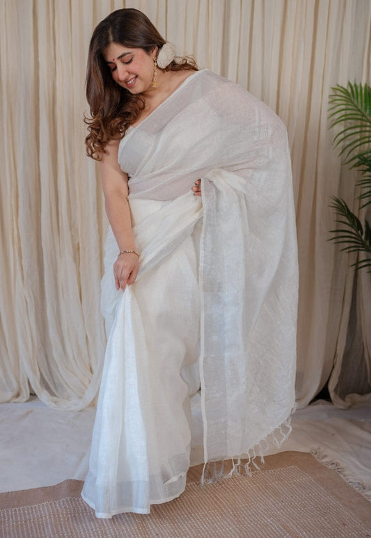 PJFB25A003 White Silver Pure Handloom Linen Saree