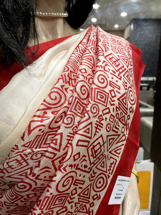 SP24A147 White Red Pure Bishnupuri Silk Saree