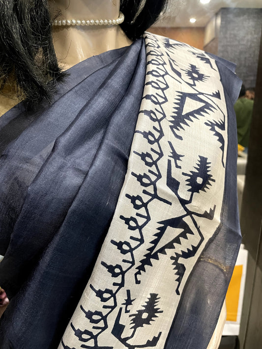 SP24A127 Cream Black Pure Block Print Tussar Silk Saree