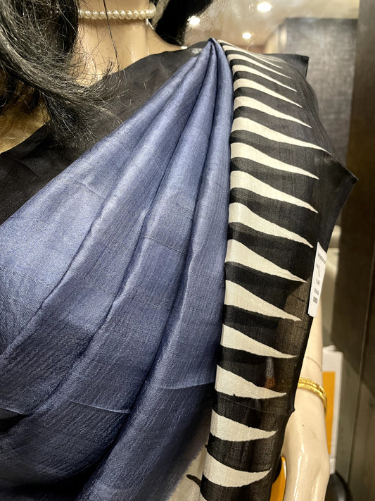SP24A118 Blue White Pure Block Print Tussar Silk Saree