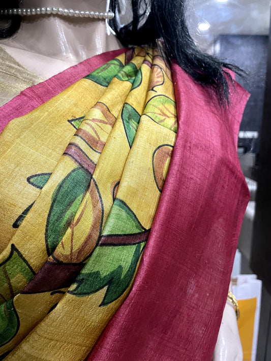 SP24A164 Yellow Rose Pure Block Print Tussar Silk Saree