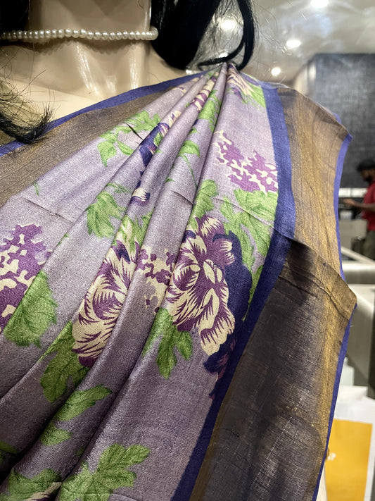 SP24A131 Purple Rose Pure Block Print Tussar Silk Saree