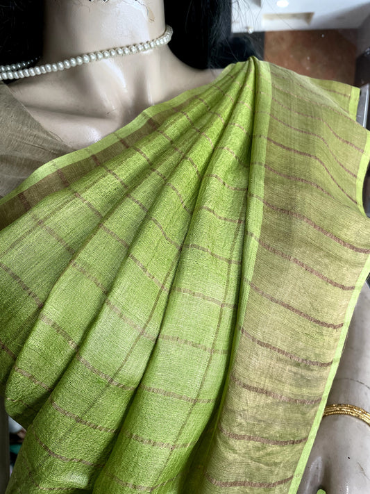 JA25A013 Green Gold Pure Block Print Tussar Silk Saree