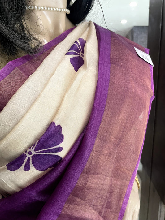 SP24A114 White Purple Pure Block Print Tussar Silk Saree