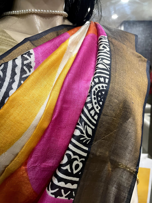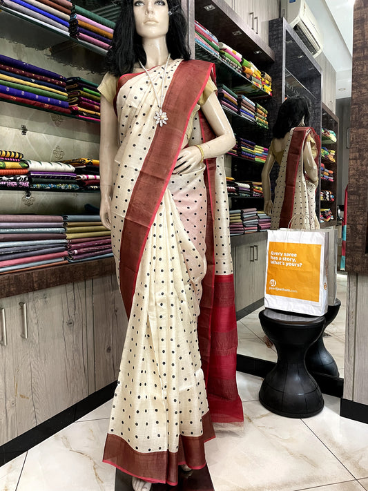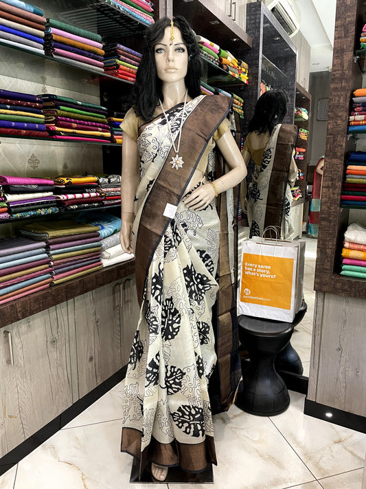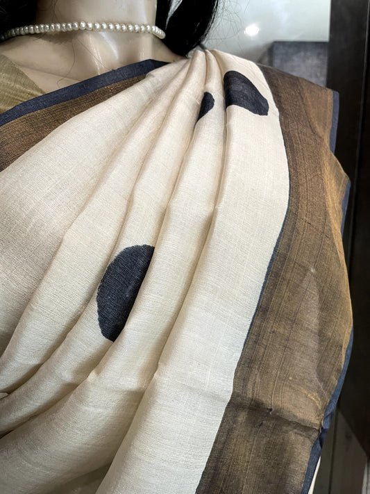 SP24A127 Cream Black Pure Block Print Tussar Silk Saree