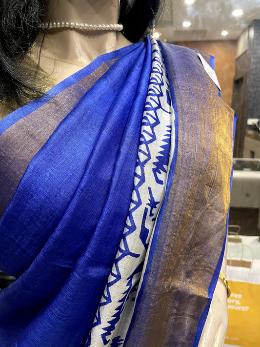 SP24A118 Blue White Pure Block Print Tussar Silk Saree