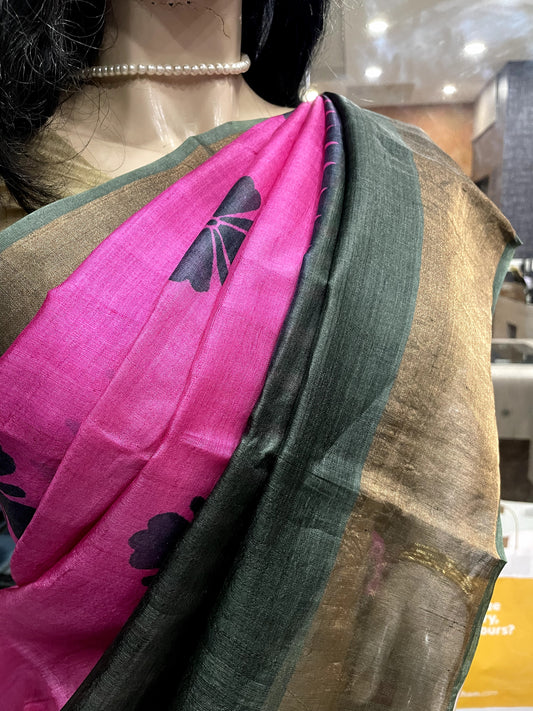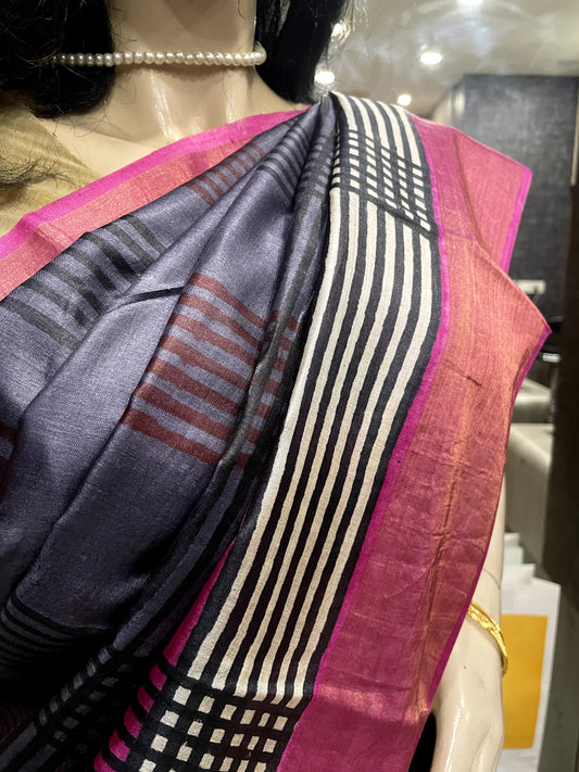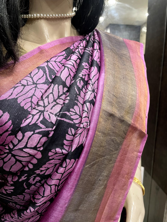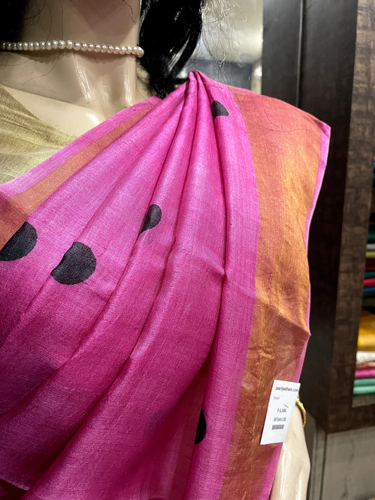 SP24A134 Pink Black Pure Block Print Tussar Silk Saree