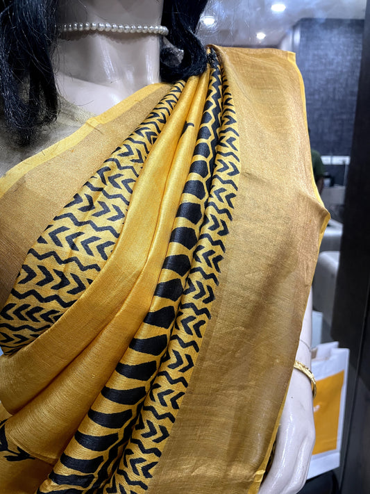 SP24A121 Yellow Black Pure Block Print Tussar Silk Saree