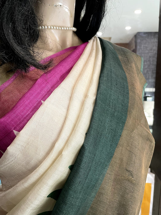 Gold Cream Floral Hand Painted Tussar Silk Saree JLHPT02