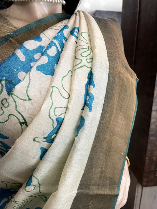 SP24A130 White Blue Pure Block Print Tussar Silk Saree