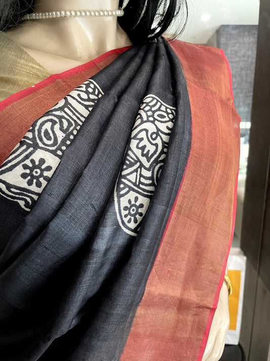 SP24A129 Black Red Pure Block Print Tussar Silk Saree