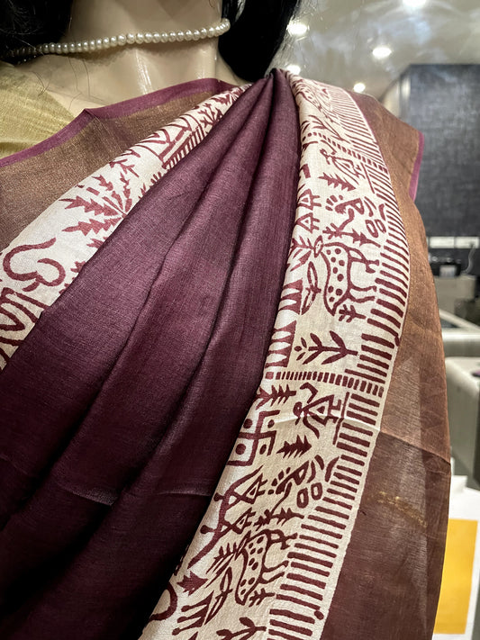 PJAP21A044 Wine Gold Hand Painted Tussar Silk Saree