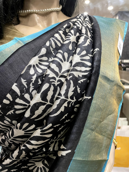 SP24A139 Black Blue Pure Block Print Tussar Silk Saree
