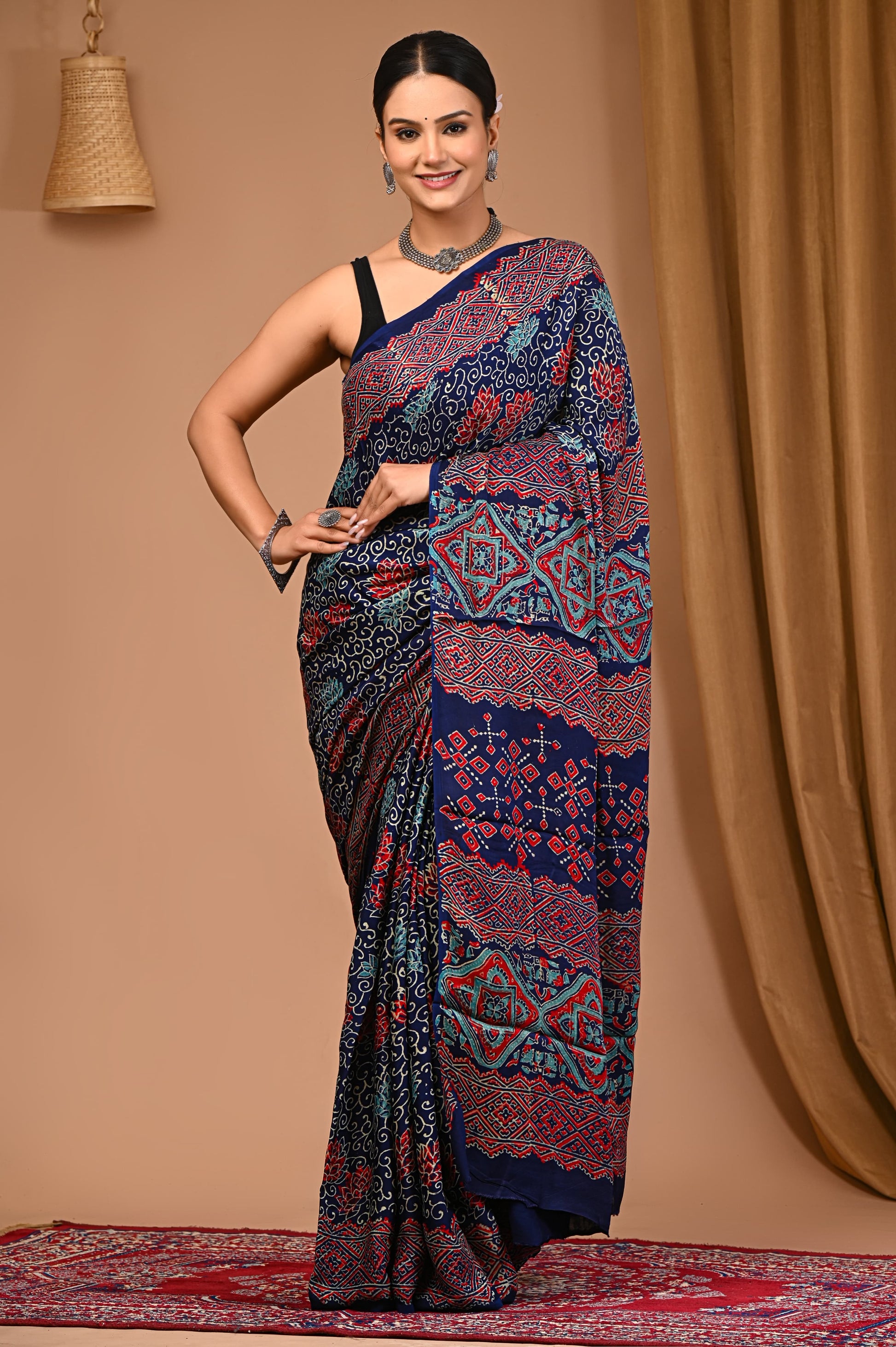 PJNV25A009 Royal Blue Pure Block Print Modal Silk Saree