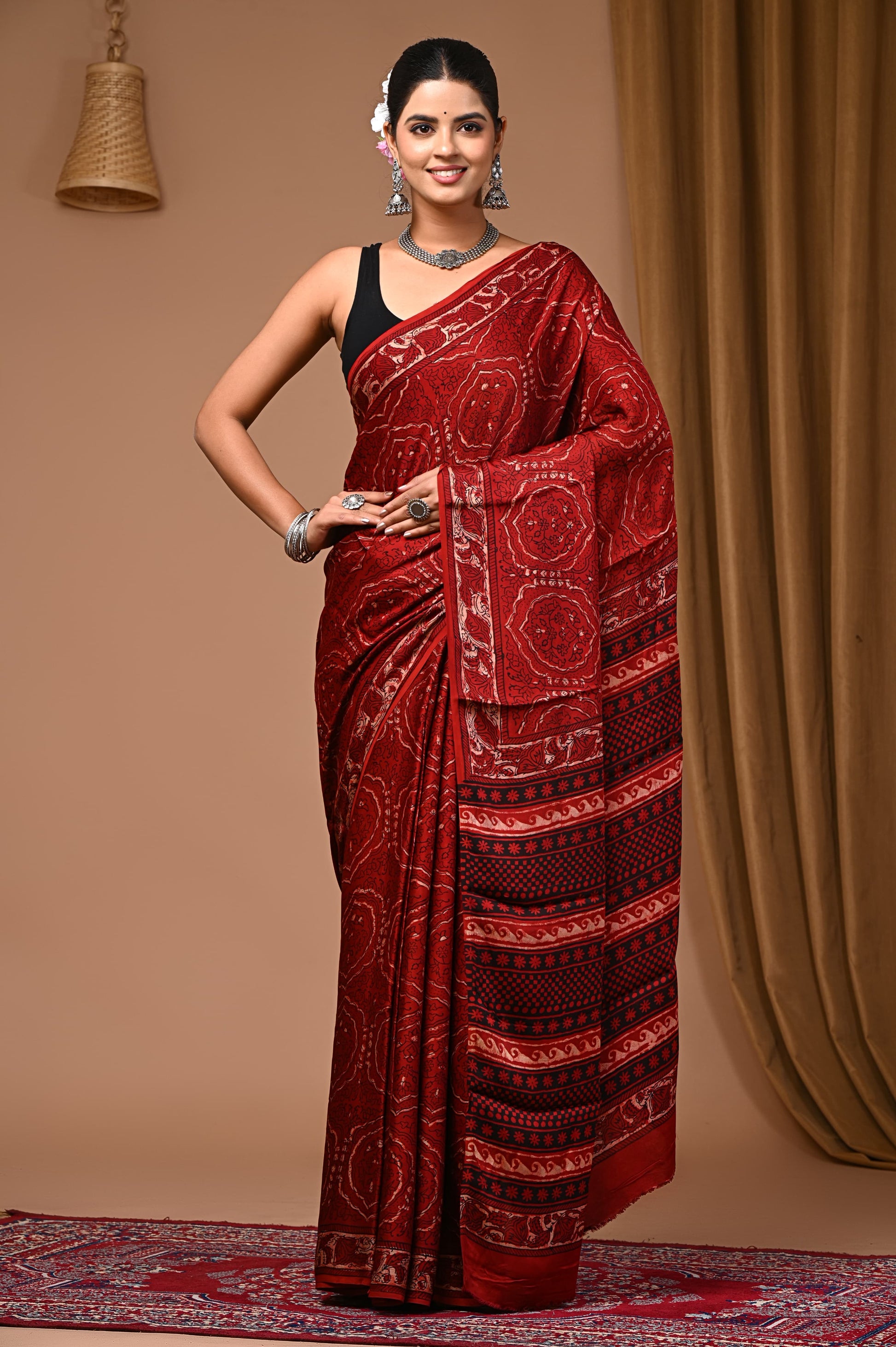 PJNV25A049 Wine Red Pure Block Print Modal Silk Saree
