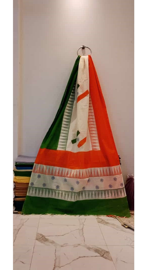 Colour : Body - White, Pallu - Orange with Green